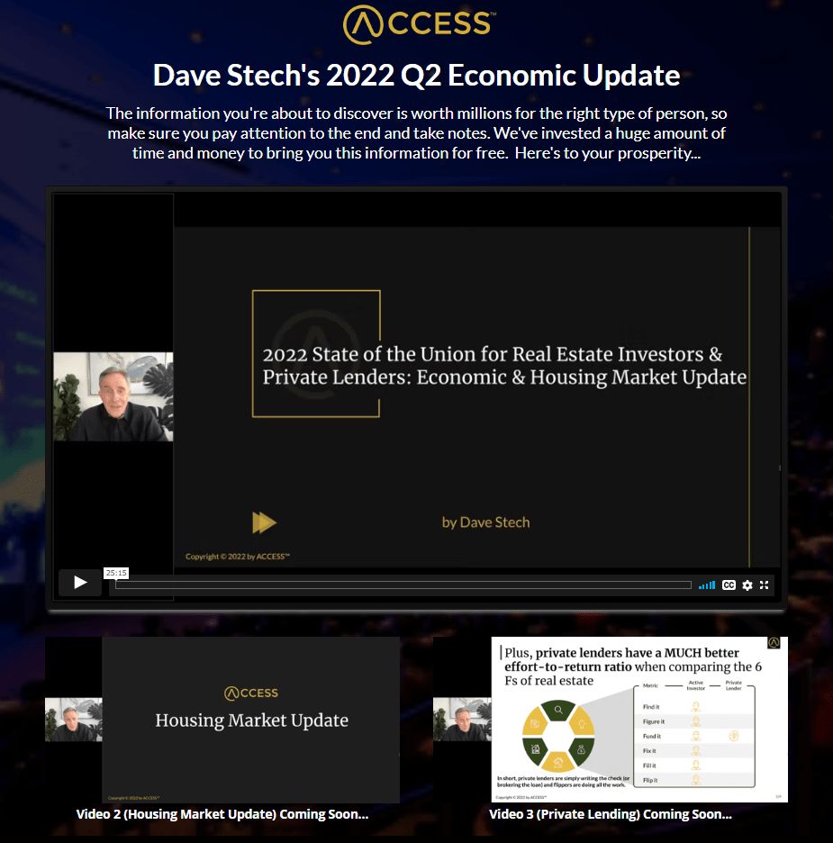 Dave gets the timing right through research (his unfair competitive advantage), which he’s used to successfully get in and out of real estate at the perfect time during each of the last 4 market shifts. He now shares that same research every quarter in the form of his free housing market update webinars (what you are getting access to today).